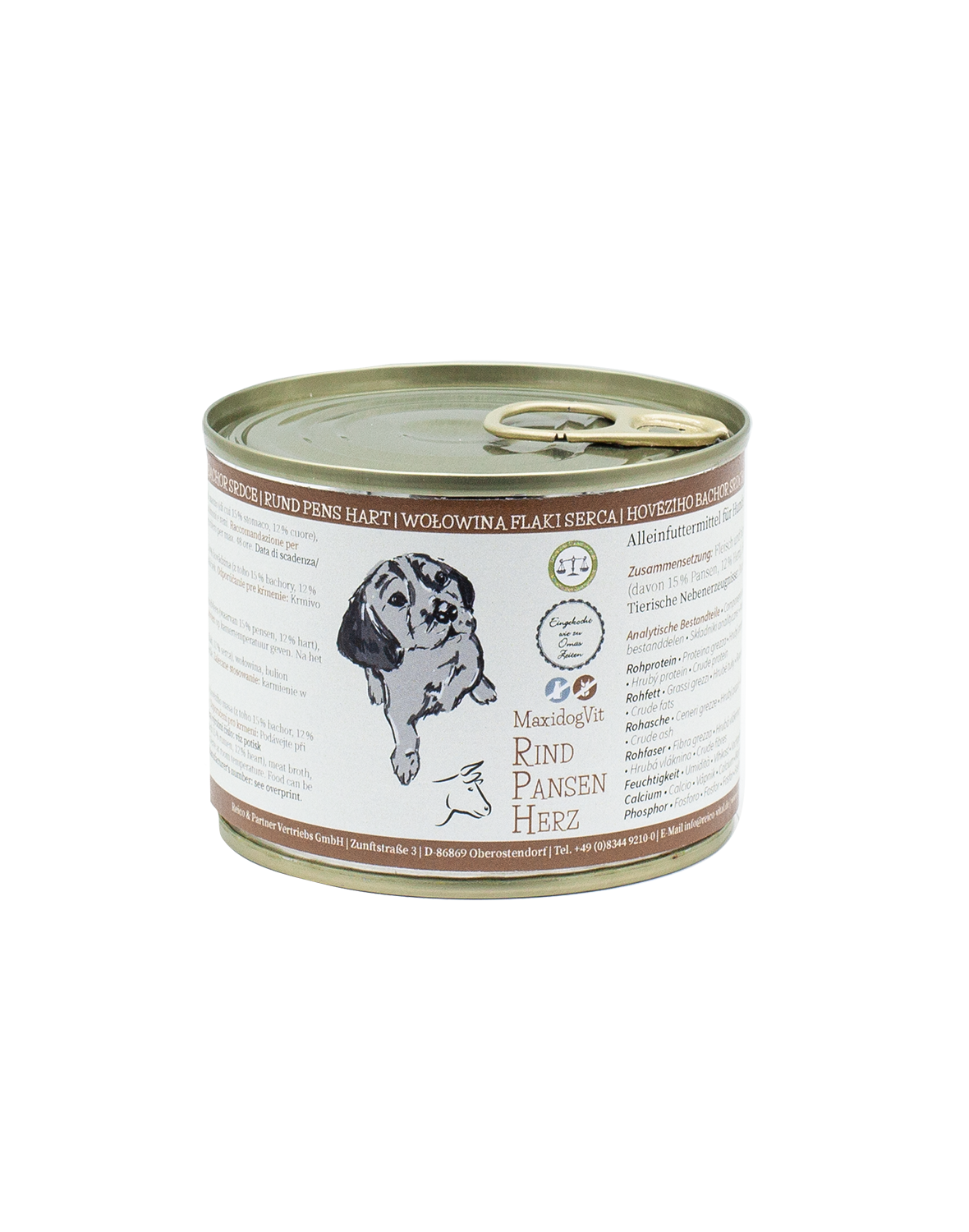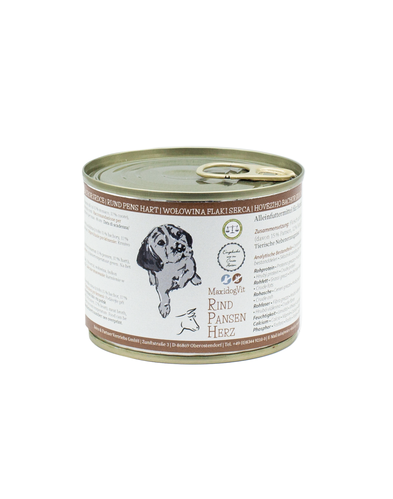 l vostro atleta a quattro zampe offriamo solo il meglio: succosa carne di manzo, deliziosa trippa, appetitoso cuore e la nostra straordinaria miscela di alghe che ristabilisce il corretto equilibrio di minerali nell’organismo. MaxidogVit Rind Pansen Herz (Manzo Trippa Cuore) è la scelta ideale per i cani attivi che necessitano di cibo ad alto potere saziante.
