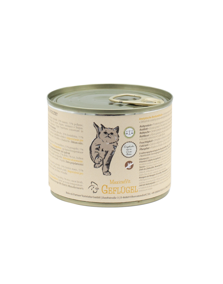 MaxicatVit pollame è un mangime completo con solo ingredienti di alta qualità, prodotto in Germania e imbottigliato delicatamente a freddo. Non contiene aromi, conservanti e zuccheri aggiunti. Prova le nostre altre varietà per una maggiore varietà. Raccomandazione per l’alimentazione: una lattina (200 g) copre il fabbisogno giornaliero di un gatto di peso fino a 3 kg. Si prega di nutrire sempre a temperatura ambiente e adattare la quantità di cibo alla razza, all’età e al livello di attività.