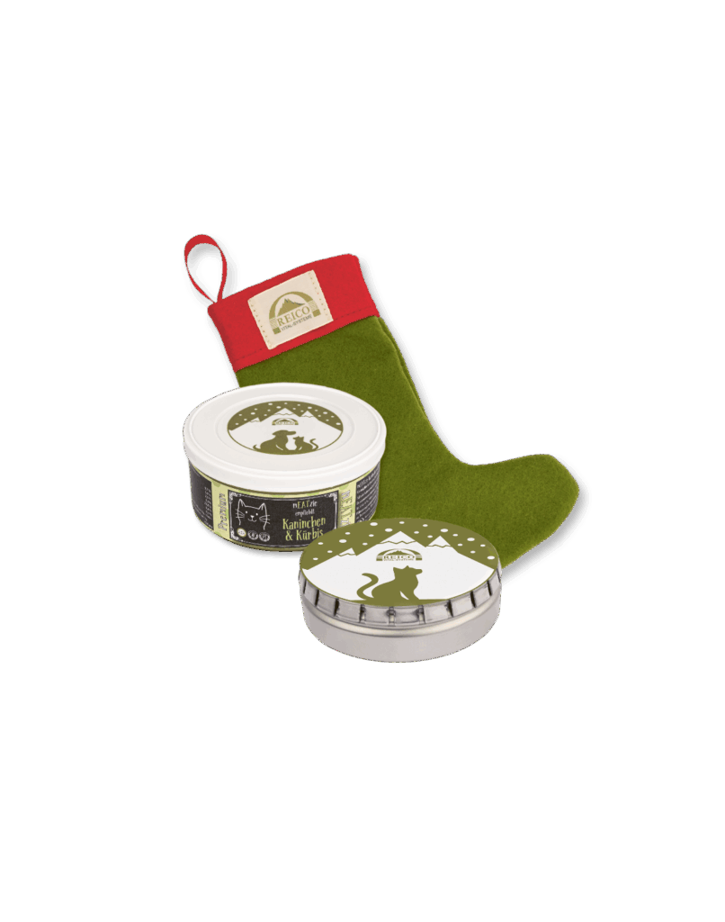 Questo set per le Feste contiene tutto ciò che fa battere il cuore dei mici: una grande e decorativa calza di Natale, perfetta da mettere sotto l’albero e da riempire con delizie di alta qualità. Il cuore del pacchetto è una lattina da 85 g di alimento umido mEATzie, con coniglio e zucca raffinati – preparato con cura, particolarmente gustoso e ideale anche per gatti sensibili.