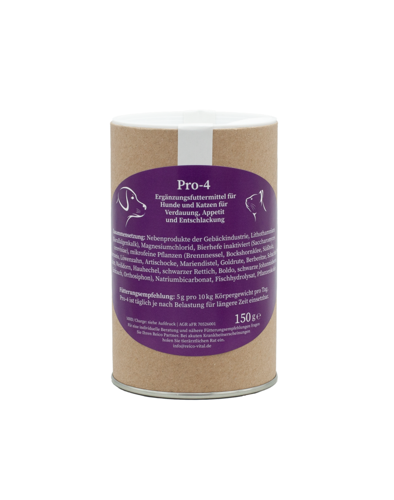 Pro-4 è una miscela di erbe, vitamine del gruppo B e amminoacidi appositamente studiata per proteggere gli organi interni, quali ad esempio fegato, pancreas, reni e cistifellea. Può prevenire i problemi intestinali e favorisce la digestione senza sviluppo di gas. Pro-4 è inoltre indicato per sostenere l’animale nel ripristino della flora batterica intestinale.
